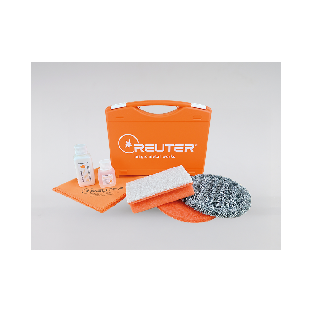 Zestaw zawiera: 1 x Pad czyszczący (pomarańczowy, 150 mm); 1 x Pad polerujący z mikrofibry (szary, 150 mm); 1 x gąbka czyszcząca (pomarańczowa); 1 x środek czyszczący (Abrascive Cleaner, 100 ml); 1 x preparat Pre$Post Clean (50ml); 1 x para jednorazowych rękawiczek, 1 x ściereczka z mikrofibry "Reuter"